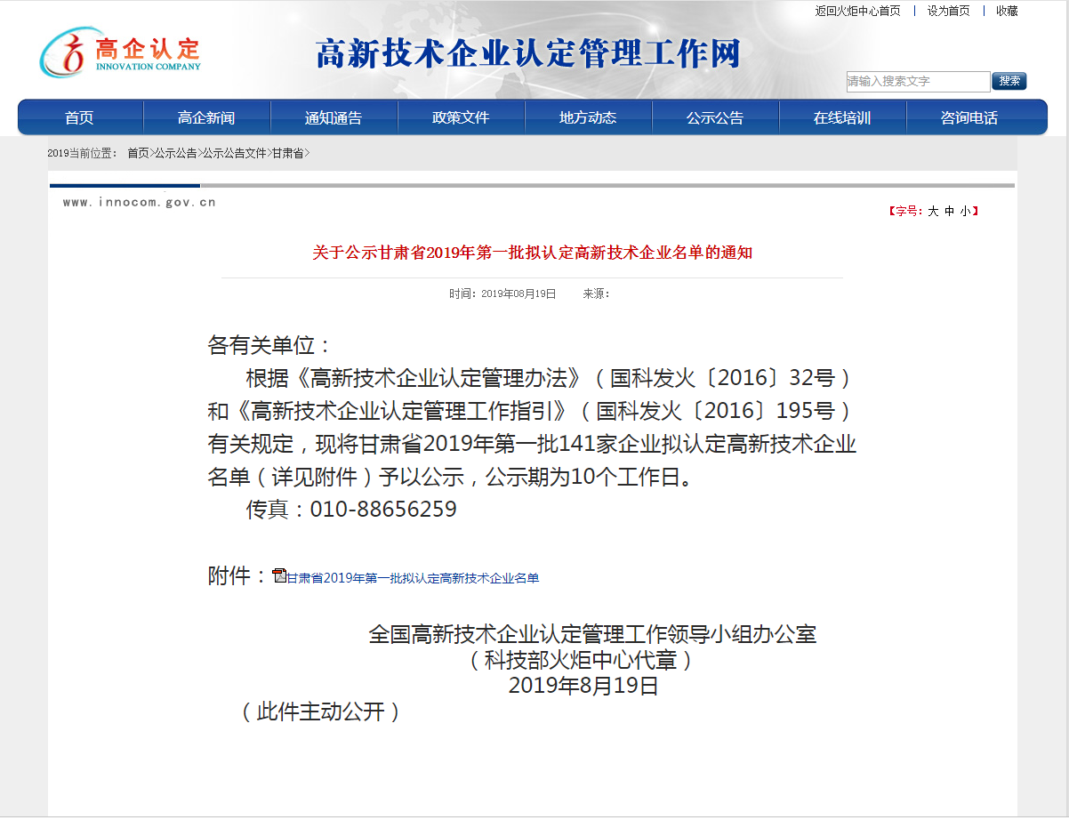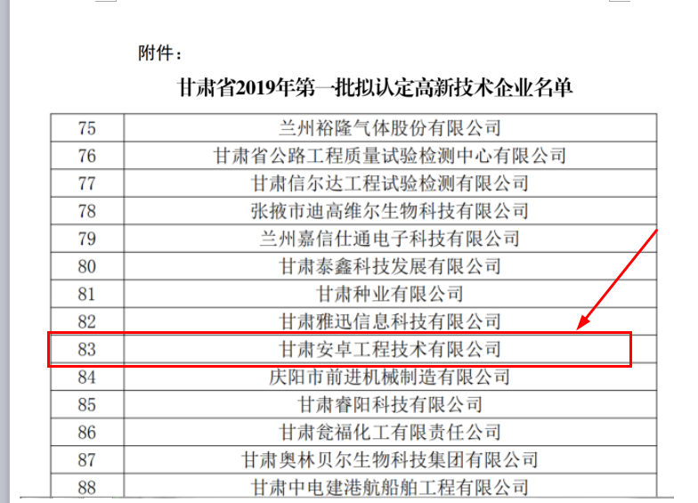 根據(jù)《高新技術(shù)企業(yè)認定管理辦法》(國科發(fā)火〔2016〕32號)和《高新技術(shù)企業(yè)認定管理工作指引》(國科發(fā)火〔2016〕195號)有關(guān)規(guī)定,經(jīng)公司申報、地方初審、專家審查等嚴格的申報程序,于2019年8月19日在“國家高新技術(shù)企業(yè)認定工作網(wǎng)”上公示了“甘肅省2019年第一批擬認定高新技術(shù)企業(yè)名單”甘肅安卓工程技術(shù)有限公司榜上有名。